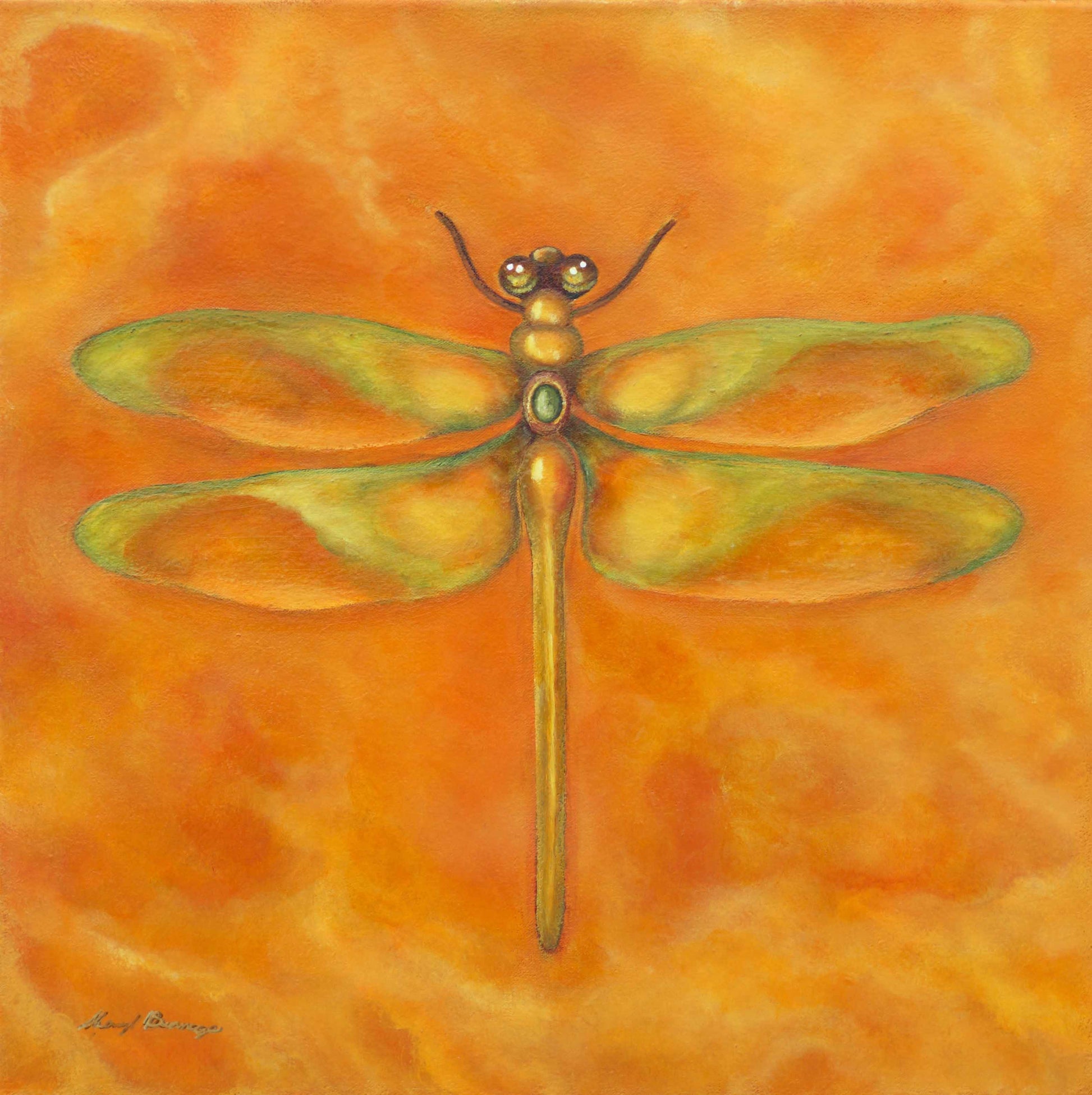 From my Sisters collection, this dragonfly painting is named after my sister Trina. Original dragonfly painting on Orange background 20" x 20" acrylic on canvas.